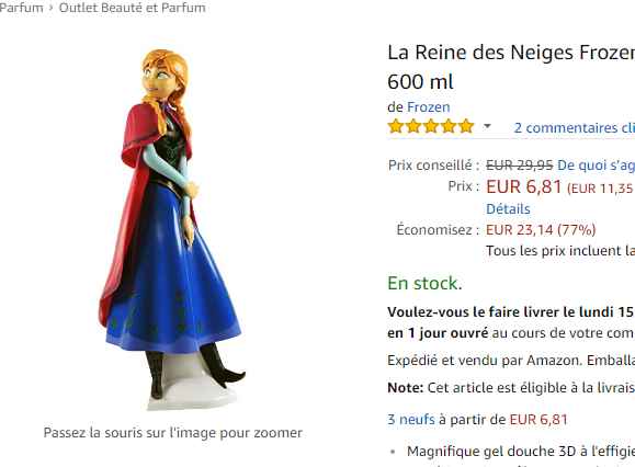 A priori un tres bon prix pour un gel douche pour petite fille : gel douche qui se presente sous la forme d’une grande figurine de la reine des neiges :