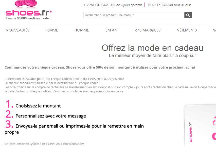 Bon plan pour s’acheter des chaussures ou pour en offrir ! Sur le site shoes (du meme groupe que spartoo) , on peut voir exactement la même promotion pour l’achat d’un cheque cadeau :