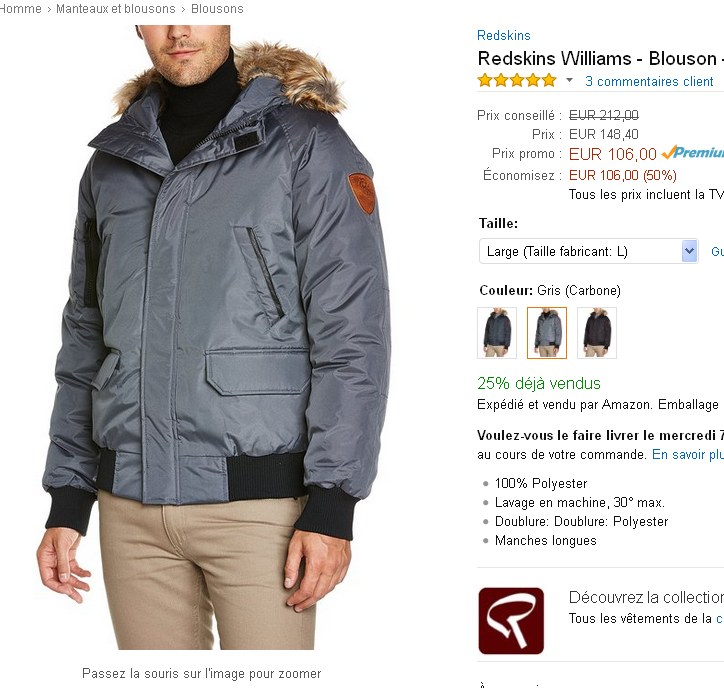 Gros blouson hiver redskins à 106 euros le 6 octobre .. faire vite