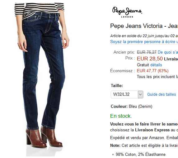 Les soldes durent jusqu’au 2 aout, cependant amazon à tendance à faire bouger les prix d’un jour sur l’autre , et notamment de les remonter ces derniers jours … donc si ce jeans vous interesse , il ne faut sans doute pas trop trainer