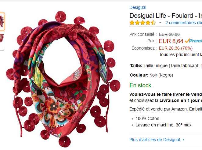 Super affaire sur amazon, qui propose le foulard desigual Life à 7.34 euros en vente flash le 23 mars