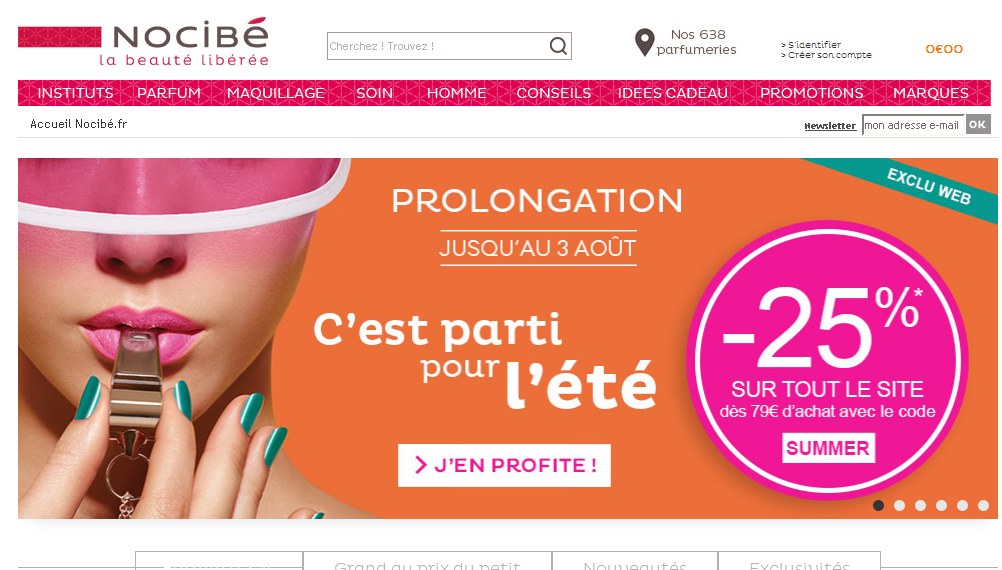 25 pourcent de réduction sur le site nocibe jusqu’au 3 aout … Une offre valable à condition d’acheter pour au moins 79 euros ..