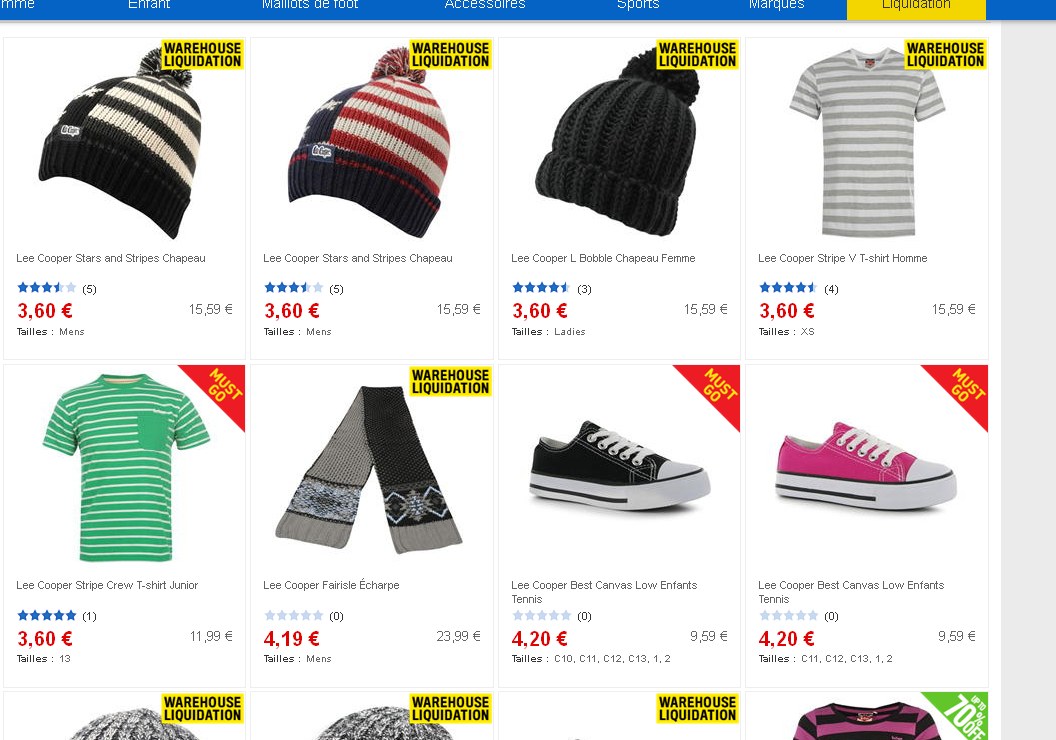 De nombres articles de la marque Lee Cooper pas chers sur le site anglais sportdirect : baskets toiles enfants à 4.2 euros, tee shirts adultes à moins de 5 euros, polos enfants à 5 euros, sweat enfants à 5.39 euros …