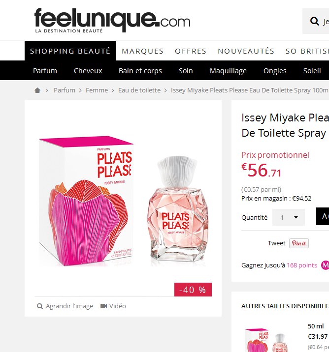 Avec l’eau de toilette Pleats please de Issey Miyake vendu pas cher à 56.71 euros et qui passe donc à 46.71 euros en utilisant le code de réduction « ANNIVERSAIRE10 » ..