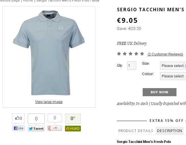 De retour à 7.69 euros port inclu , le polo sergio Tacchini bleu sur le site the hut .. Disponible en taille L M et S , ce polo vendu dejà au super prix de 9.05 euros passe à 7.69 en utilisant le code promo « POLOS48 » qui donne 15% de remise immédiate ..