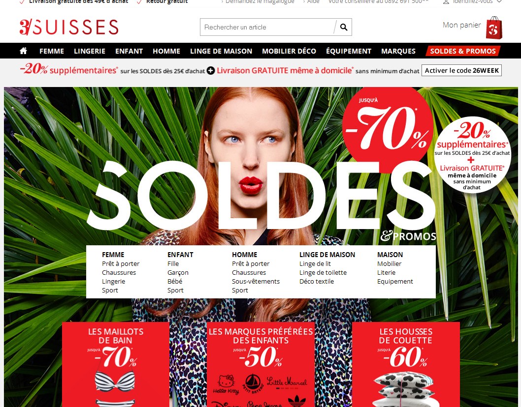 Bon plan soldes … Avec 20 pourcent de réduction supplementaires sur le site 3 suisses en utilisant le code de réduction « 26WEEK » …
