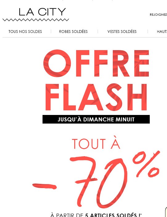 Bon plan soldes pour les femmes qui aiment les articles des magasins La City : pour l’achat de 5 articles soldés, l’ensemble bénéficie de 70% de réduction …