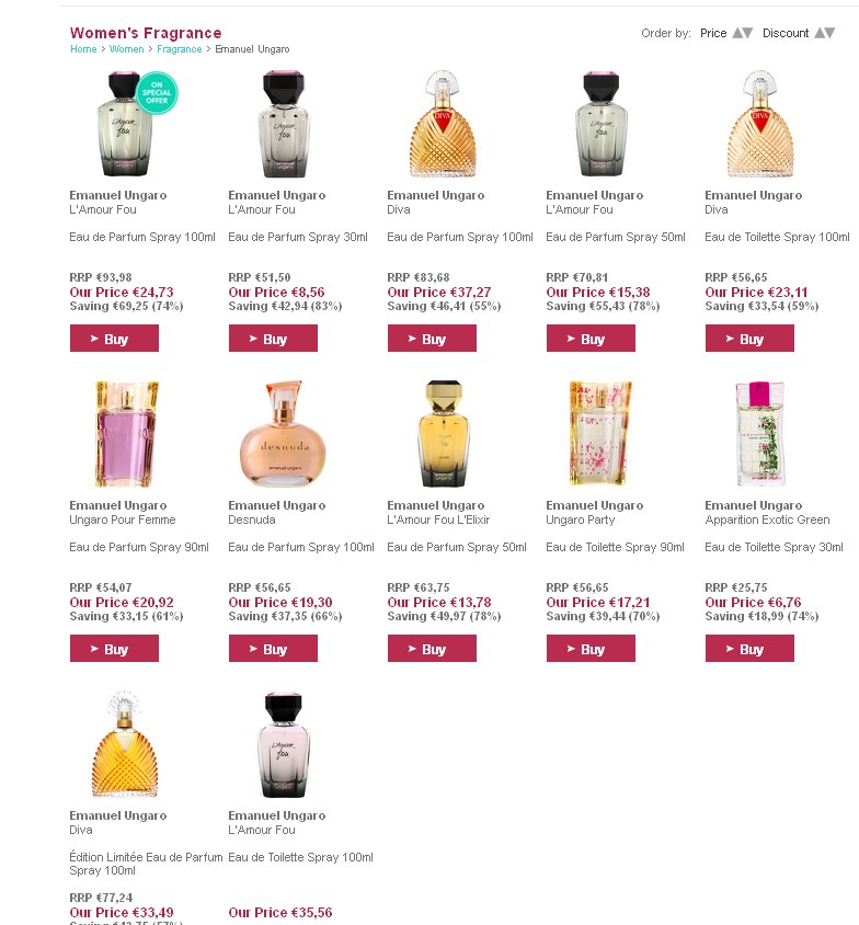 On peut voir ainsi à 21.8€ l’eau de toilette DIVA en 100ml , un coffret l’amour fou 100ml (eau de parfum + lotion pour le corps + sac ) , ungaro pour femmes 90ml à 19€ , ungaro for her 100ml à 15€ …