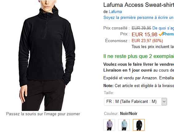Pas cher pour du lafuma … Pour les femmes à la recherche d’un sweat polaire que l’on pourra par exemple utiliser lors de randonnées , on peut voir un tres bon prix sur amazon :