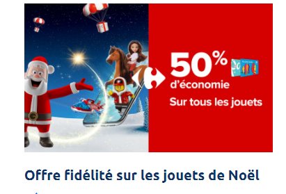Samedi 28 et dimanche 29 novembre 2020 uniquement, 50% d’économies* créditées sur votre Carte Fidélité sur tous les jouets de Noël disponibles dans l’un de nos supermarchés Carrefour Market et Market (hors Carrefour Drive) situés en France métropolitaine, Corse comprise et participants** à l’opération.