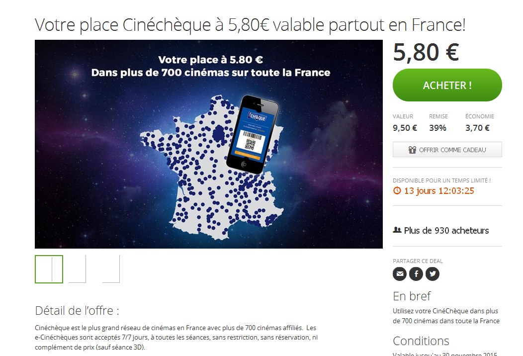 Il y a souvent des offres concernant les grandes chaines de cinema (CGR , Gaumont Pathé ) mais rarement dans les cinémas indépendants qui sont les seuls accessibles dans de nombreuses regions .. Donc bonne affaire