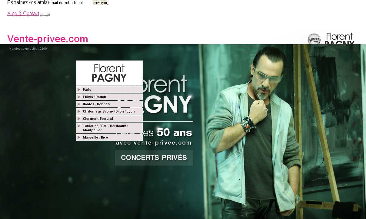 Pour les fans de Florent Pagny , une offre interessante à priori exclusive pour vente privee : des places à 28 euros pour la tournée du chanteur qui va se derouler dans les villes suivantes: Paris , Lievin , Rouen , Nantes , Rennes, Chalon sur saone, Dijon , Lyon , Clermont, Toulouse, Pau , Bordeaux , Montpellier , Marseille , Nice .. durant le mois de novembre (entre le 6 et 30 ) .