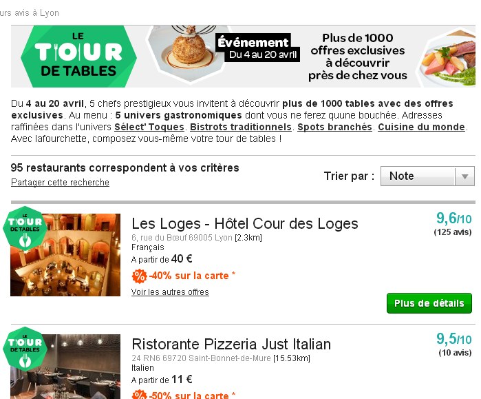 On peut voir ainsi qu’il y a 40% de remise sur le restaurant Les Loges à Lyon , le restaurant de l’un des hotels les plus chics de Lyon ..