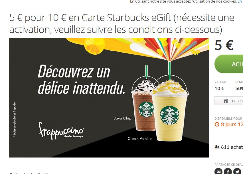 Réduction chez Starbucks café : 5 euros la carte cadeau de 10 euros