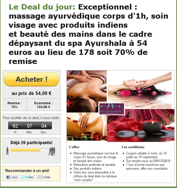 Achetez le bon chez groupon avant le 19 juillet . Ce bon sera valable durant 2 mois jusqu’au 19 septembre .