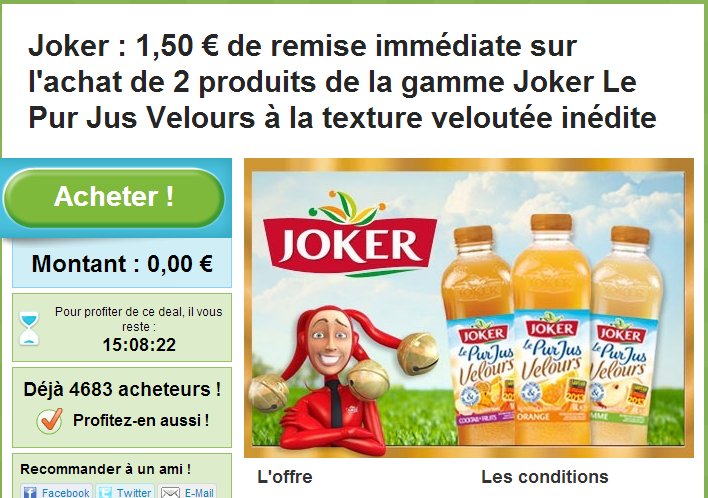 Nouvelle offre de bons de reduction sur groupon pour l’achat de produit alimentaire : cette fois ci on peut donc obtenir gratuitement un bon de réduction de 1.5 euros valable pour l’achat de 2 boissons Joker le pur velour ..