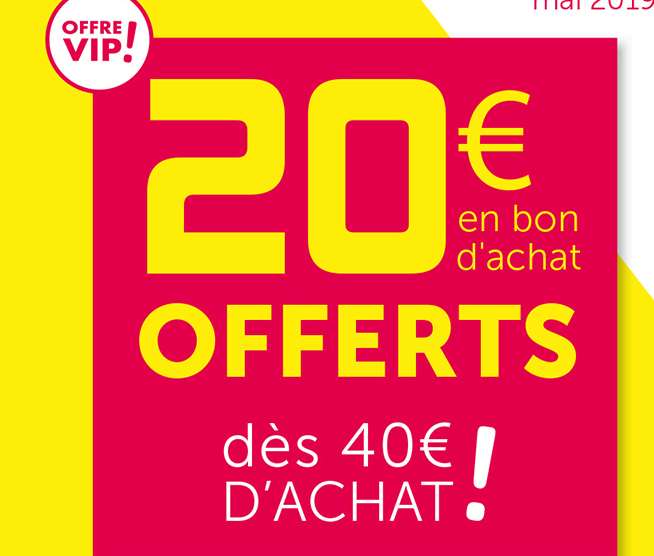 Du 24 au 26 mai , pour une note d’au moins 40€ en caisse on récupere un bon d’achat de 20€ à utiliser dans le meme magasin..