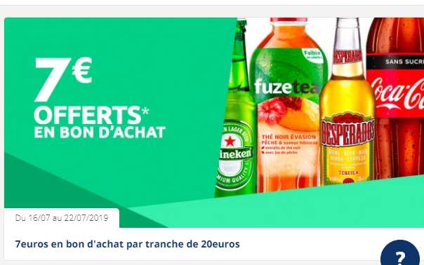 Carrefour : 7€ offerts par tranche de 20 sur boisson ( biere , jus de fruits, soda ..)