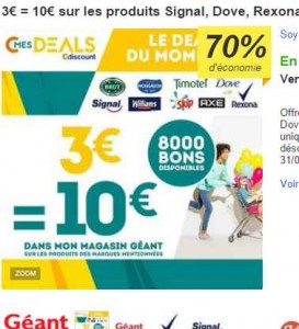 Geant Casino : 3 euros le bon d’achat de 10 pour acheter dentifrice , gel douche et autres produits