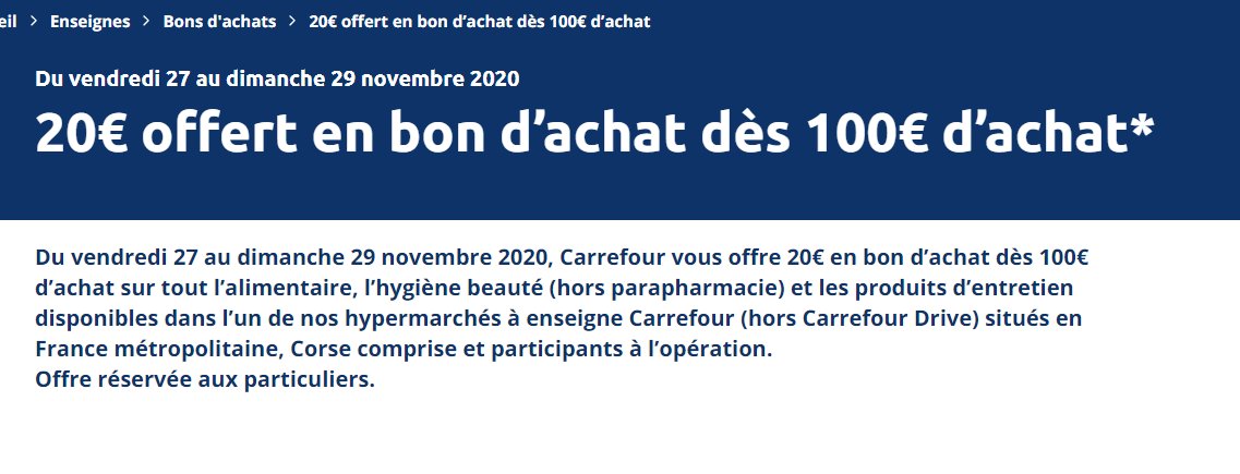 Du vendredi 27 au dimanche 29 novembre 2020 uniquement, Carrefour vous offre 20 euros en bon(s) d’achat dès 100 euros d’achat sur tout l’alimentaire, l’hygiène beauté (hors parapharmacie) et les produits d’entretien disponibles dans l’un de nos hypermarchés à enseigne Carrefour (hors Carrefour Drive) situés en France métropolitaine, Corse comprise et participants à l’opération, hors Beauvais Centre, Beauvais Sud, Bellegarde, Belley, Carcassonne, Château Thierry, Cluses, Dax, Fécamp, Ferney Voltaire, Hazebrouk, Lorient, Margencel, Mont de Marsan, Narbonne, Orléans, Plouzane, La Roche Sur Yon, Saint Renan, Sens Maillot, Sens Voulx, Touques, Voiron.