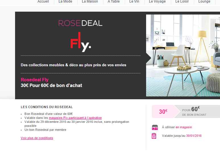 Si vous aimez les meubles et les articles de déco , maisons vendu dans les magasins Fly , une offre peut vous interesser du coté de vente privee … Qui propose pour 30 euros un bon d’achat d’une valeur de 60 à utiliser donc dans l’un des magasin de l’enseigne