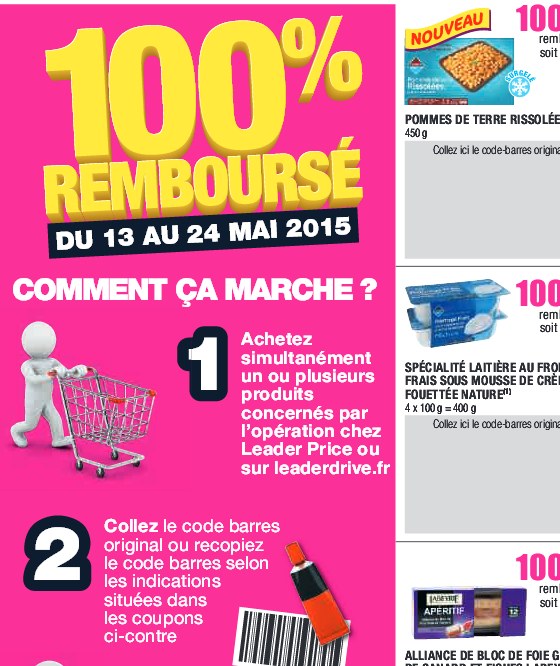 Attention : tous les leader price ne participent peut etre pas à l’opération 100% remboursé mai 2015 .. il convient de le vérifier .. Pour cela il faut aller sur le site leader price , et regarder si le magasin propose le prospectus