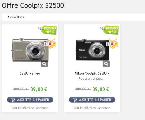 Appareil Photo Nikon Coolpix S2500 à moins de 46 euros port inclu
