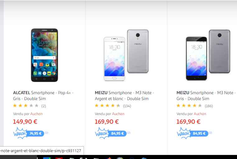 il y a notamment le meizu m3 note 5.5 pouces qui revient à 84.5, le zenfone go qui revient à 89€ , le sony xperia xa qui revient à 124.5€ , le zenfone 3 lazer qui revient à 139.5€ …
