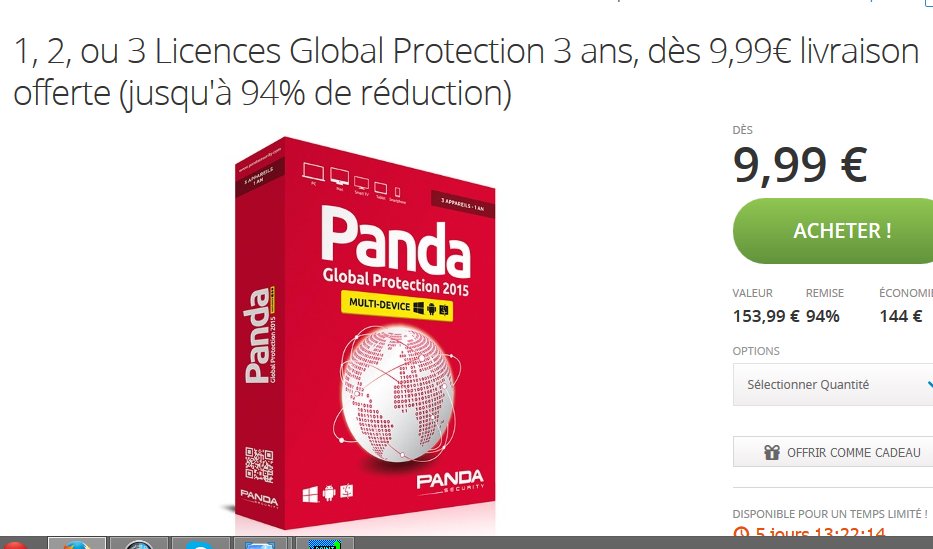 Mais sinon, pour ne pas s’embeter et pour vraiment pas cher , on peut voir l’offre Panda Global Protection qui se trouve sur groupon: et qui pour 9.9 EUROS propose donc cet antivirus pour 3 ANS … Soit donc un prix de revient de 3.33 euros par an pour une solution globale de protection !