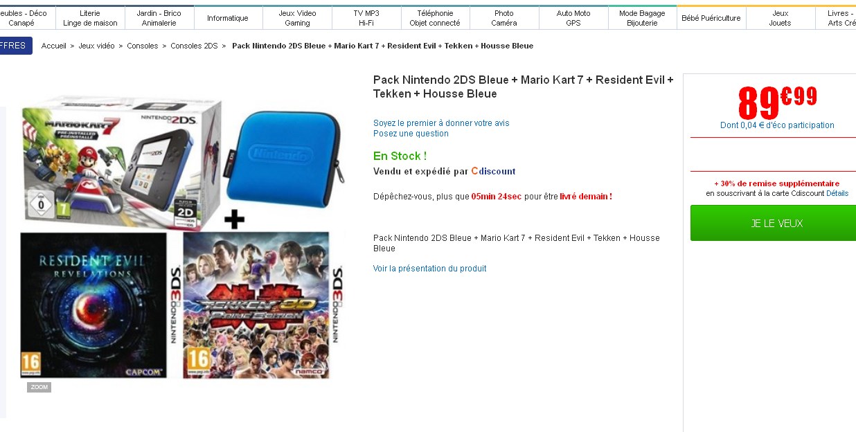 Vendue à ce prix sur cdiscount … une bonne affaire quand on voit la plupart des boutiques vendre le pack nintendo 2ds + mario kart à ce prix …là on a en prime 2 jeux supplémentaires et un étui de protection