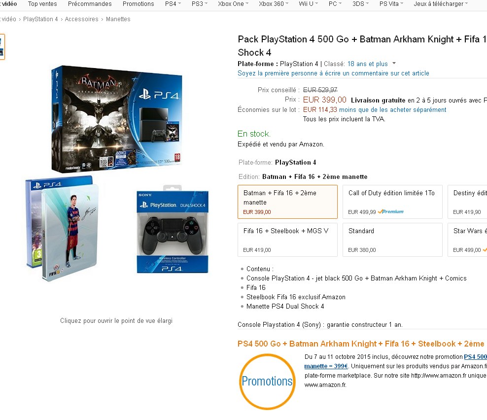 Une offre sur amazon très intéressante, quand on peut voir le pack PS4 + FIFA16 à 440 euros sur cdiscount … et que l’on sait qu’une manette DualShock4 coute autour de 50 euros … Il y aussi un steelbook Fifa16 (un boitier en métal )