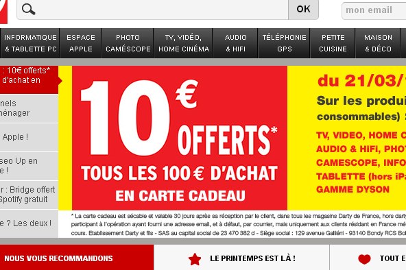 Jusqu’au 26 mars sur le site darty.com il y a 10 euros offerts en bon d’achat par tranche de 100 euros d’achats sur de nombreux rayons : informatique,tv , tablette, aspirateur dyson , home cinema…