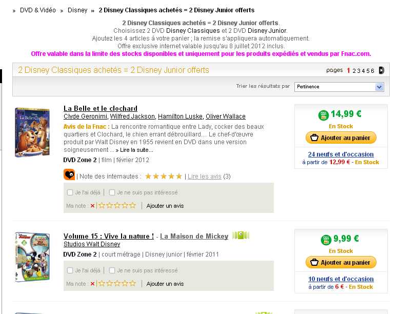 Sur le site de la fnac pour 2 dvd de films classiques achetés (la belle et le clochard, raiponce, le roi lion , la belle et la bete, mary poppins , fantasia , alice au pays des merveilles, bambi, pinnochio , la princesse et la grenouille, alladin …… ), 2 dvd disney junior sont offerts ( la maison de mickey , manny et ses outils .. ) ..