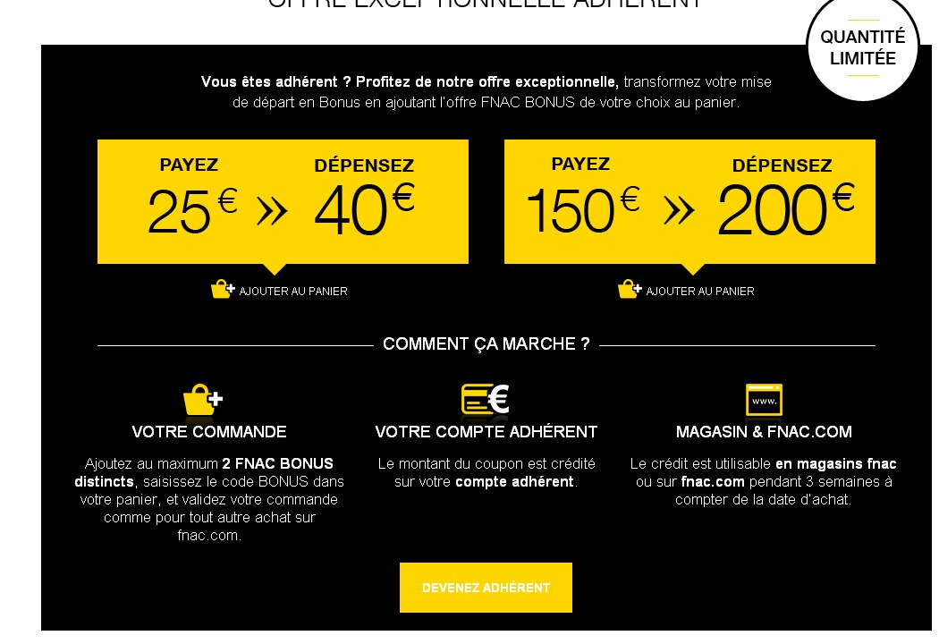 Fnac :bons d’achats à prix reduits pour les adhérents .. (25 euros le bon de 40 .. 150 celui de 100 euros)