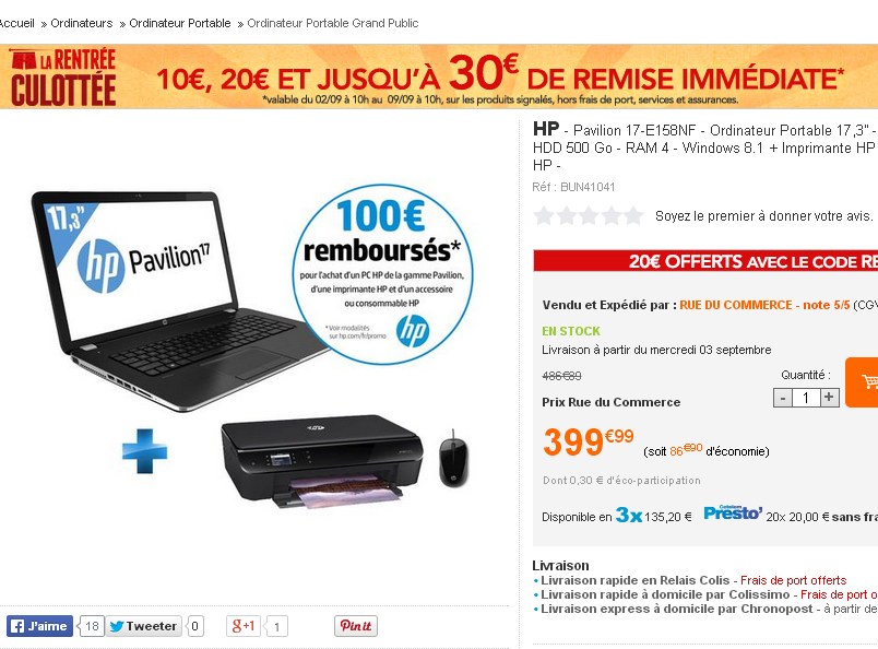 Encore une bonne affaire pour un équipement complet informatique : Sur rueducommerce on a 369 euros un pack regroupant un pc portable hp 17 pouces windows + imprimante multifonction wifi + souris … 399euros – 20 euros avec le code promo « BEST20 » …