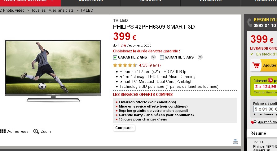 Encore une tv philips à moins de 400 euros … Cette fois ci chez darty qui propose la tv philips 42PFH6309 à ce prix …