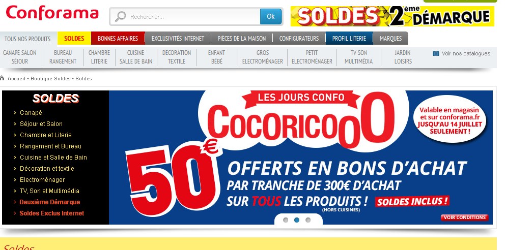 Soldes sur le site conforama , avec une nouvelle démarque et en plus jusqu’au 14 juillet, 50 euros offerts par tranche de 300 euros d’achats …