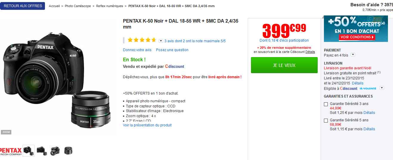 Super affaire pour un appareil photos reflex : 399 euros le pentax k50 sur cdiscount mais avec 50% de remboursés sous forme de bons d’achats ..