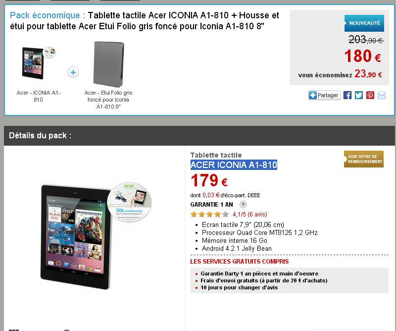 Encore une offre pour une tablette tactile qui peut etre interessante : chez darty pour l’achat d’une tablette Acer e1 810 on a pour un euro de plus l’etui officiel acer .. Et donc l’ensemble pour 180 euros ..