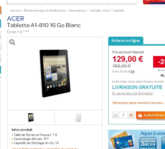 Tablette Acer quad core 7.9 pouces à 122.55 euros port inclus