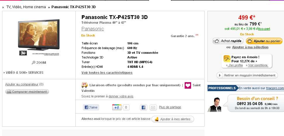 Peut etre une affaire interessante si vous cherchez une nouvelle tv … Sur le site de la fnac se trouve soldée la tv plasma 40 pouces Panasonic TX-P42ST30 à 499 euros port inclu au lieu de 799..