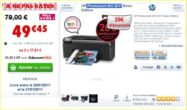 En effet actuellement chez cdiscount est vendue à la Hp Photosmart all in one 2011 Basic à 49.45 euros (soit le prix le plus bas trouvable actuellement , elle est vendu au moins 20 euros de plus chez les autres revendeurs .. darty , amazon).