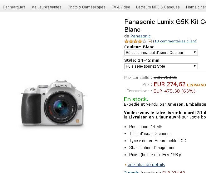 Si vous cherchez un appareil photos moyen/haut de gamme, il semble y avoir un tres bon prix sur amazon : On peut voir l’appareil photo hybride Panasonic Lumix G5K à 273 euros .. Appareil avec un objectif de 14-42mm …