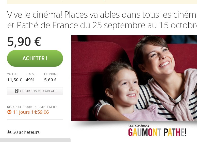5.9 euros des places pour les cinemas Gaumont pathé de France … Des e-billets vendus sur groupon et valable pour des seances du 25 septembre au 15 octobre 2014 …