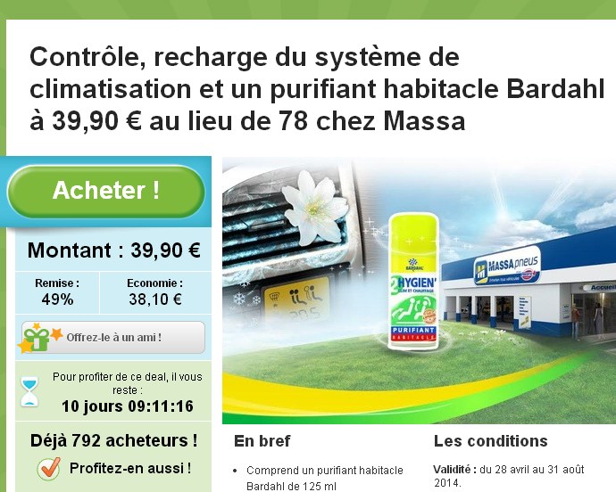 39.9 euros la recharge climatisation pour une voiture dans un centre auto « MASSA PNEUS » (il y en a 90 en France ) .. Cette offre est donc presente sur groupon, il faut donc acheter le bon et prendre le rendez vous en ligne depuis le site Massa