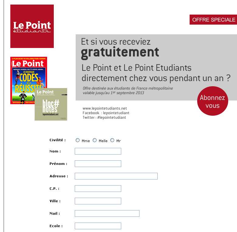Super affaire pour un abonnement gratuit au magazine le point : Une offre normalement réservée aux étudiants . Il suffit de saisir ses coordonnées afin de recevoir durant un an chaque semaine les magazines le point et le point étudiant..