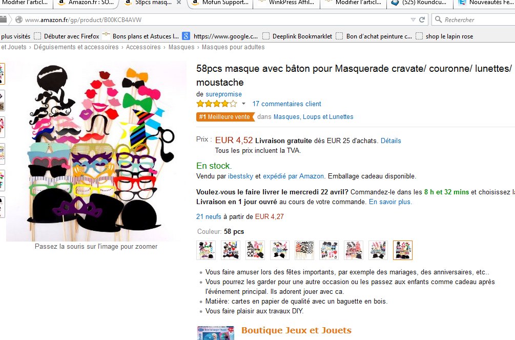 Bonne affaire pour des accessoires pour faire des photobooth .. 4.52 euros le lot de 52 pieces avec lunettes, chapeaux, moustaches, barbes, cravates et autres ..