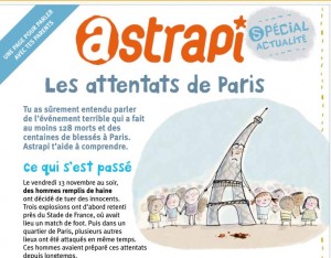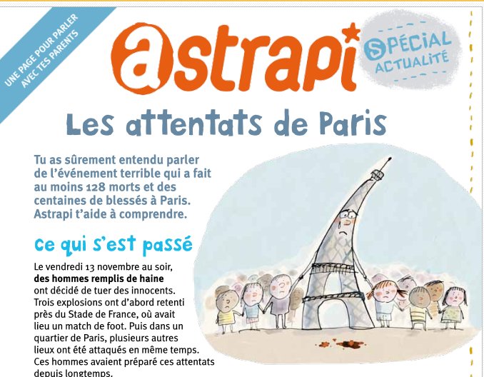 Suite aux attentats du 13 novembre , et comme il est parfois difficile pour les parents d’expliquer les faits, le magazine astrapi de l’édteur bayard jeunesse propose un petit livret à télécharger pour faciliter aux parents l’explication de ce qui s’est passé ..