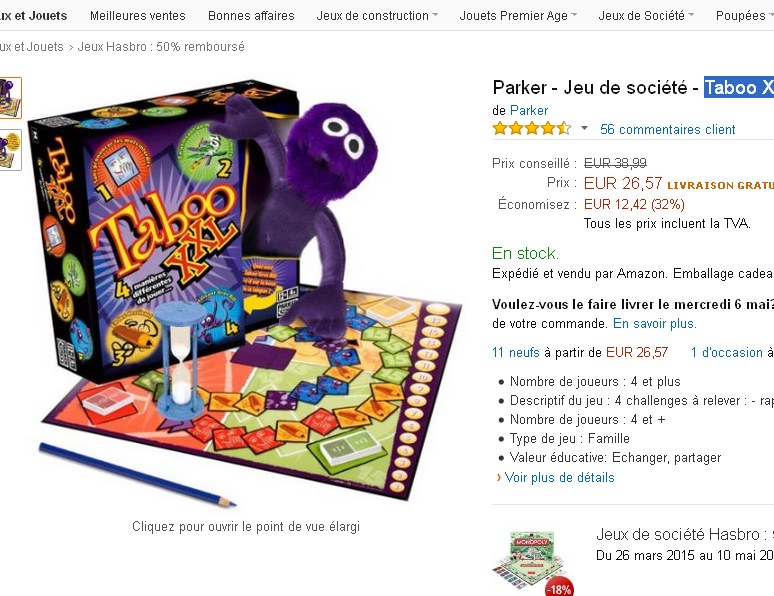Bonne affaire pour le jeu de societé taboo xxl de parker : il est vendu à 26.51 euros sur amazon, ce qui est déjà vraiment pas cher car on le voir à plus de 40 chez carrefour, cultura , avenue des jeux et d’autres …