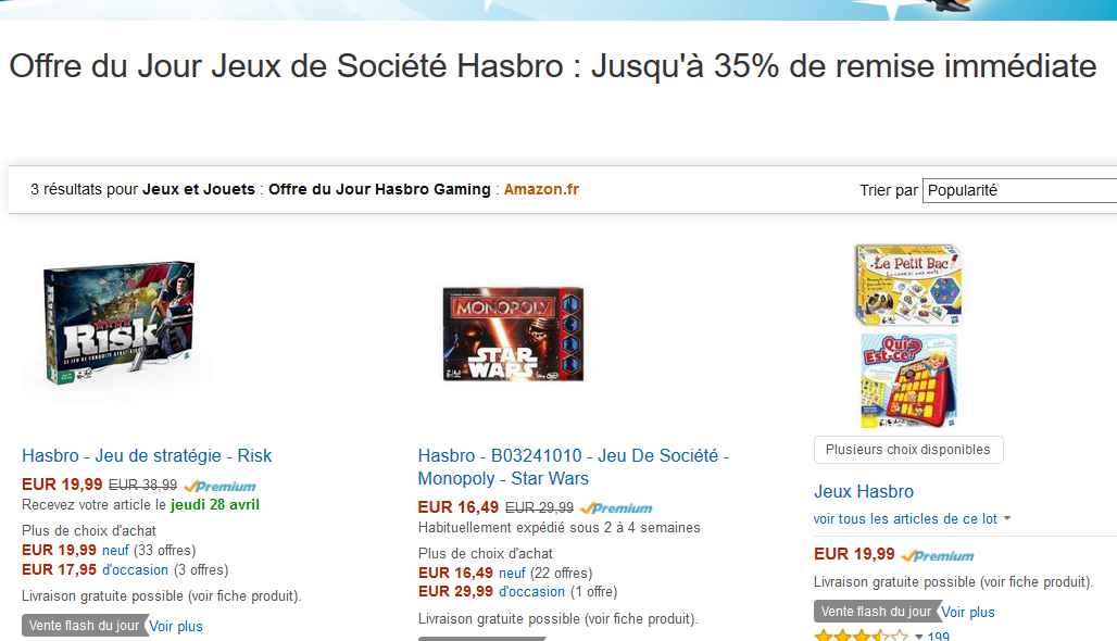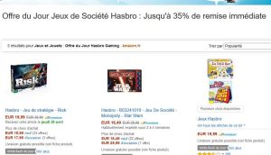 Avec notamment le celebrissime jeu de strategie RISK vendu à 19.99 euros , ou encore Monopoly Star Wars à 16.49 euros et aussi un pack regroupant « qui est ce » et « le petit bac » pour 19.99 euros …